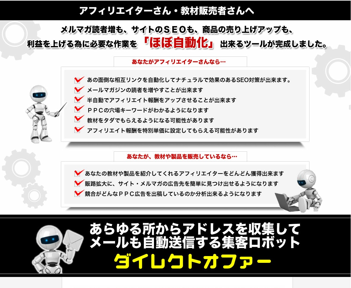 メールアドレス自動収集&メール自動送信、ダイレクトオファー。相互リンク自動化、メルマガ読者増、PPC攻略、アフィリエイターさん獲得に。